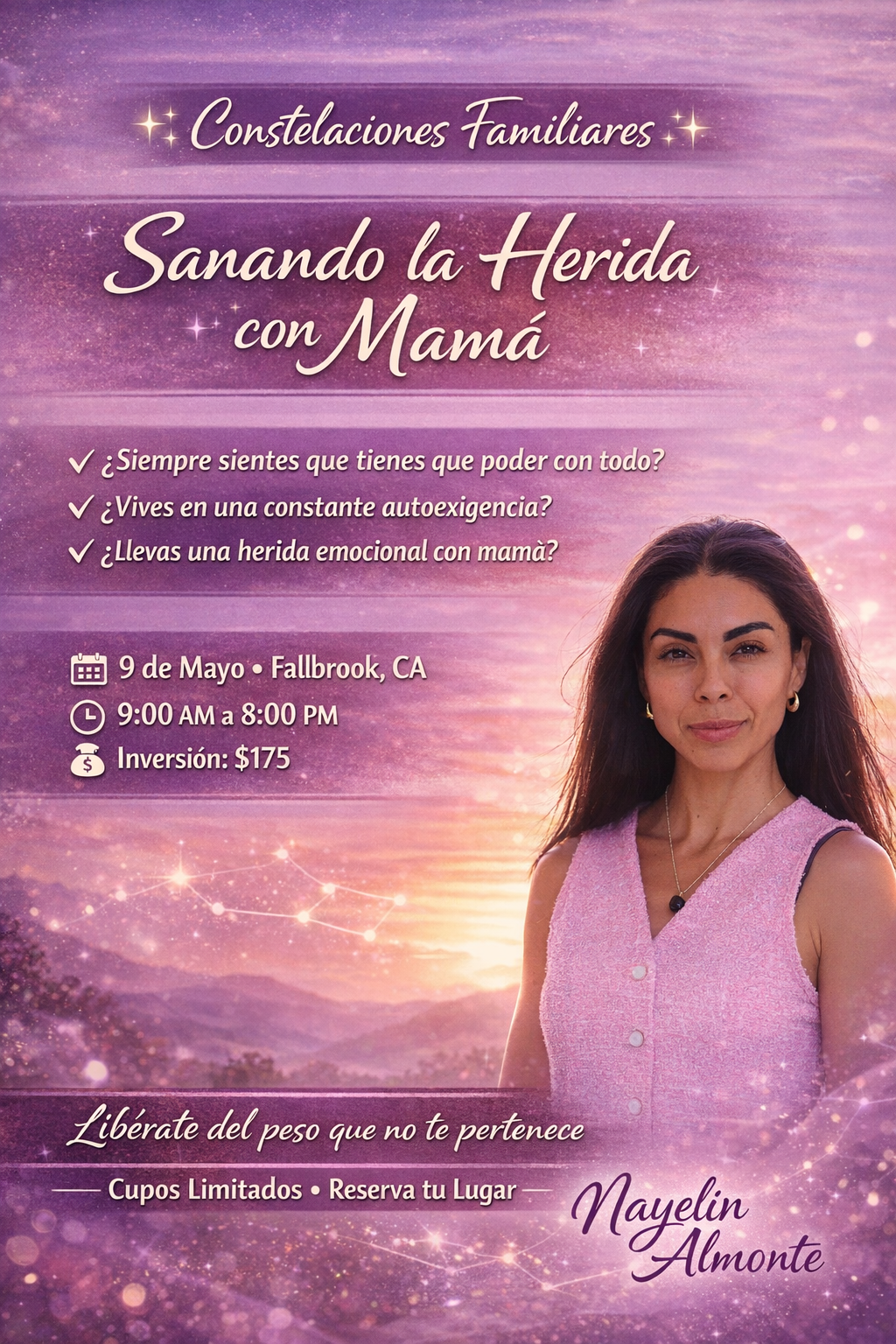 Es una experiencia profunda para mirar tu historia, liberar lo que cargas… y reconectar contigo desde un lugar más consciente y amoroso.